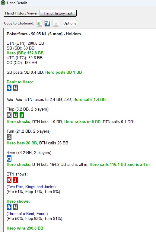 По поводу выбора бет сайзинга, чаще получить колл не = больше EV. Возьмем пример, ты ставишь 40bb и соперник фолдит в 45% случаев, колл допустим в 55% случаев (понятно, что рассчет не идеален, так как у соперника есть опция сыграть пуш, и у нас не полные натсы, но нам для примера подойдет), так вот 40bb*0,55 = 22bb. Теперь мы пушим 120bb, чтобы наш профит был такой же, нам нужно в 3 раза меньше коллов, т.е. всего 18,15% и если соперник фолдит в 78% случаев, то 120bb будет лучше с натсовыми и около натсовыми руками, чем 40bb. Единственное, когда уменьшение бет сайзинга имеет место быть, это когда игрок агрессивно играет против маленьких бетов, сам делая пуши на велью с руками хуже и блефами, а это как правило не про низкие лимиты, так что по умолчанию мы не ставим мало с сильной рукой.
