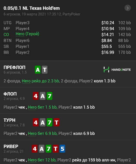 Флоп точно нужно было ставить больше, если это фиш, от 3 до 4 бб. Тёрн хороший сайз. А вот по риверу нет смысла ставить мало. Фиш не выкинет любую Ax руку. И второй момент если бы на ривере была ставка 3/4 банка, то на его рейз это легчайший фолд, так как обычно фиши не блефуют в крупные ставки. Здесь же на чуть больше полпота он мог отморозиться с блефом, но не алином в такой глубине. Мы не можем коллировать такой дикий сайз не имея конкретного ридса на оппонента.