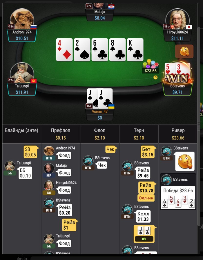 Ошибка ли чек на флопе? Нет не ошибка и если бы получилось сыграть чек/рейз, то ты бы даже и не думал об этом. Ошибка ли поставить овербет на терне? И снова не ошибка, наша рука часто окажется лучшей, осталось 2 улицы для того, что бы вложить все деньги в банк и заодно протект от оверкарт. А вот колл пуша точно ошибка, как я люблю говорить "наша денежная линия здесь..." и здесь она, когда фиш нажимает колл + колл (на таком ривере правда мы бы не пушили, а на