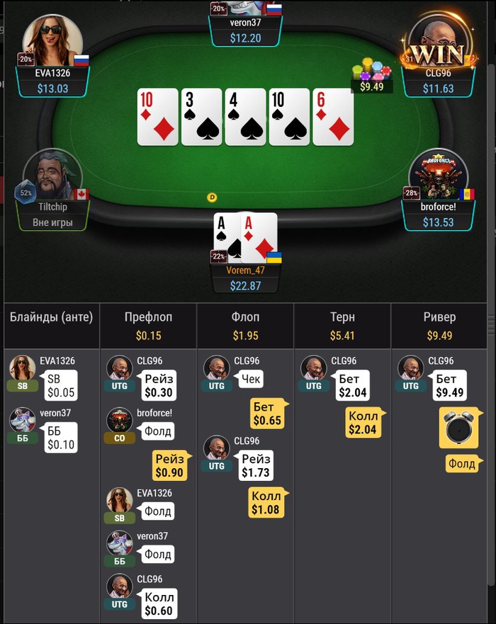 В его глазах тоже выглядит очень страшно, когда опп коллит чекрейз и коллит терн, т.е. он как минимум понимает что у тебя етсь готовая рука, поэтому так смело заявлять на ривере будет только натс, редко будут блефы, т.е. даже если там блеф, фолд все равно будет очень хороший.