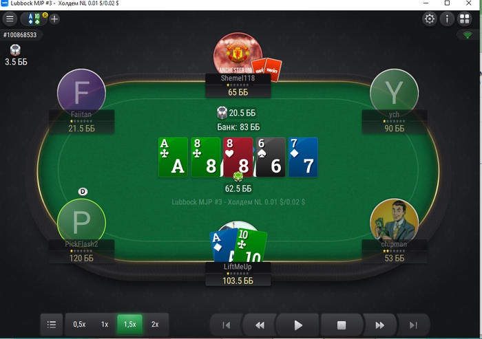 Ривер A♣8♣8♥6♠7♦ (62,5 bb)