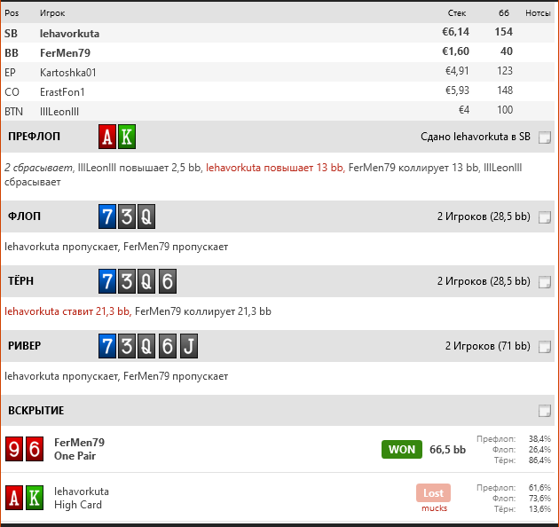 Я не понимаю какие тут могут быть вообще рассуждения. Игрок с 40bb вколил вхолодную 13bb, это всегда фиш! Какие блин диапазоны, какие нет А-хай и прочие размышления.