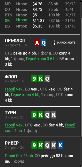 Далее постфлоп, на флопе колл, а на терне небольшой рейз до 14bb+-, для того, что бы не раздавать бесплатных карт, так же все в раздаче показали слабость и вторая пара с топ кикером, имеет сейчас достаточно много эквити (плюс второй король, уменьшил вероятность наличия Кх у соперников), слишком дешево даешь реализоваться соперникам.