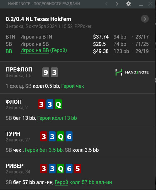 у него как полный воздух, т.к и оверпары, которые он мог залимпить, фолда тут никогда нет. на терне мы мало чего боимся, поэтому в целом можем дать ему и блефануть ривер, по сути просто заколив, ведь на рейз он выкинет весь свой воздух, а с велью мы и так выставимся на ривере, перекрутив его ставку в пуш.