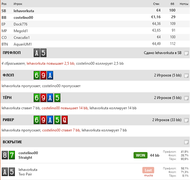 Оппонент неизвестный, вся информация-неполный стек. На терне решаю ставить крупно с сильной рукой и неожиданно получаю рейз. Стоило ли фолдить сразу? Ривер на такой сайт, думаю, надо коллировать.