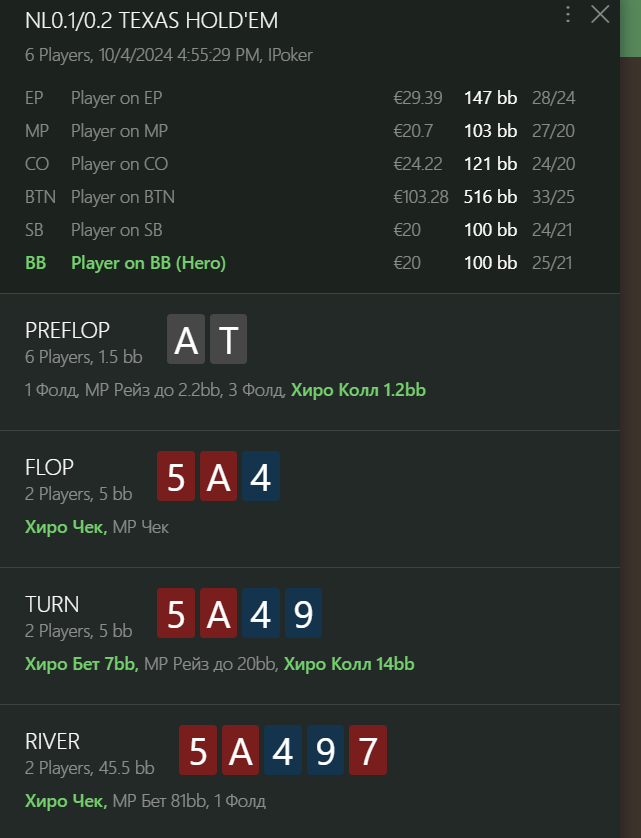 Ривер думаю фолд всегда во флопзиле я конечно понял, что сложно найти 36% рук для защиты , особенно если перепушивать терн и возможно опп это тоже понимает и готов переблефовывать, но блефов я тоже не нашел много, уж более часто дефолтный опп ставит с ними флоп, а не придумывает чекнутые линии.