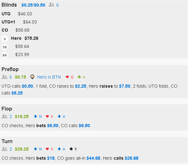 Постфлоп сайзы тоже корявые, к риверу создал ему 22%. Если решил играть в 3 улицы, то на каждой из улиц надо ставить меньше.