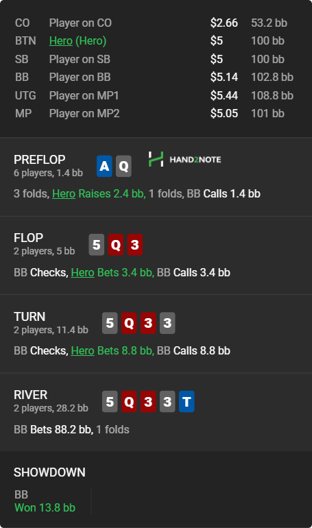 тут вопрос просто в экономической эффективности )) - нет смысла колить в ваккуме такую ставку. Если он вельюбетит - он капец как недобирает и это ему минус большой, если он так блефует - ты просто поймаешь его позже в похожей ситуации с сильноей рукой. Мы же играем не в бинго, а профессионально подходим к игре ;). Ну а если просто по игре комментарий - то он на ББ - у него там куча комб с 3-кой. Так что ты сыграл все верно... единственное как пожелание - немного больший сайзинг нужно давать с СО и БТН - 3ББ, чтобы давить на блайнды. - но это не принципаиально тут. Флоп от 1/2, терн 2/3 и на ривере на его чек тоже бет от 1/3 и фолд на пуш.