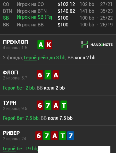 А мелкий сайз работает эффективнее как правило в ситуации если мы впереди по диапазону, и по натсам не опережаем оппонента. Здесь же крупный сайз предпочтительнее из-за наличия у нас натсового перевеса и отсутствия весомого перевеса по диапазону, а так же мы находимся без позиции, что так же является немаловажным фактором за игру без расширения контбета, при отсутствии преимуществ мелкого сайза.