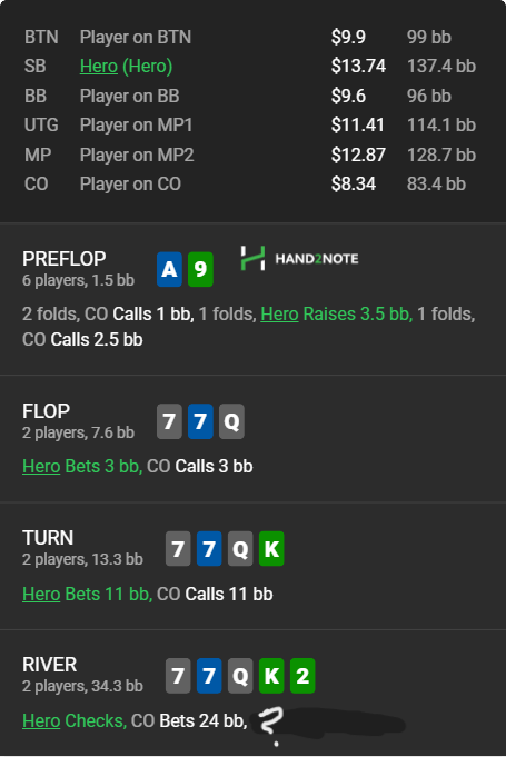 Заизолейтил пассивного фиша 41/8/3,5. Попытался продавить его на терне по выходу "страшной карты". На ривере вышел бланк, и фиш ставит 2/3. Не смотря на пассивность префлоп, на постфлопе опп становится агрессивен с завышенными МисЦбетами. Есть ли тут блеф-кетч на ривере с учетом того, что фиш мог так сыграть с миснутыми флеш-дро?