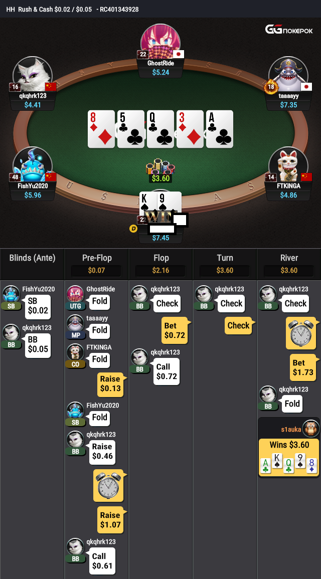 Тёрн: бланк, но с учётом твоего сайза на флопе у него тут есть много чего выкинуть и раз заварил кашу, то надо было продолжать 2/3.