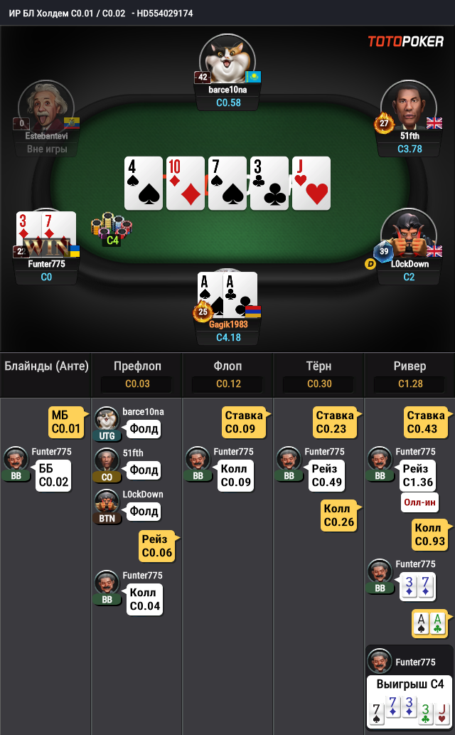 Ривер: По неведомой причине мы дончим 1/3. Блок донкбет в этой ситуации не годится, но даже если ты так сыграл, это всегда фолд на рейз. Оппонент дал тебе минрейз по тёрну на крупную ставку и запушил ривер в твой донк. Какая ещё нужна информация от него, что тебе пора упасть? И ещё обрати внимание, что уже с тёрна лежит готовый стрит на доске, а на ривере закрвает другие стриты. Тузы кажутся сильной рукой, но на ривере это всего лишь пара, пусть и оверпара, но оппонент тебе говорит своими действиями о другом. И отдатся на стек по одной паре на стрит доске как правило - суицид, без дополнительной информации на оппонента. Невменяемого агроманьяка я бы чекколил 3 раза хоть с АА, хоть с КТ на такой доске.