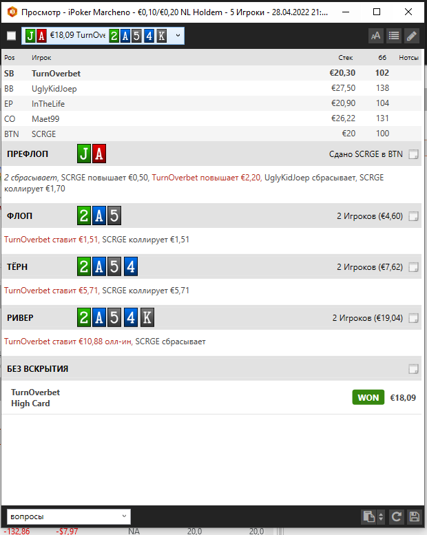 ProkterTerri, Если ты выкинешь такую руку по тёрну, то у тебя будет не просто оверфолд, а адский оверфолд за гранью вменяемости. Это просто блефкетч. Мы позади по тёрну, но процентов 30-40 имеем против его диапазона. Про то что он будет доблефовывать не надо придумывать что всегда. Да и рук не так много у него для блефа, чтобы нам сильно бояться этого. У него 3 бет лишь 9%, а это не так много, но и не так мало чтобы выкинуть ТП по тёрну. ВВСФ 49%, контбеты присутствуют. Фолд ТП на тёрне это автопрофит и кормление оппонента, способного ставить.