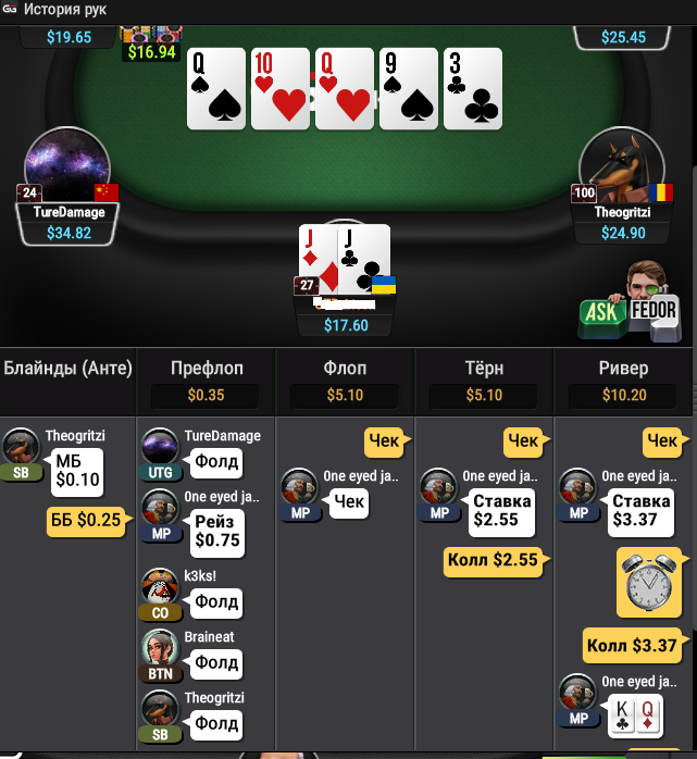 РИВЕР: Хороший чек! Получаем мелкую и надо было фолдить. Одсы были около 20%, тоесть нам надо было 1 раз из 4 забрать, чтобы оказаться в плюсе.