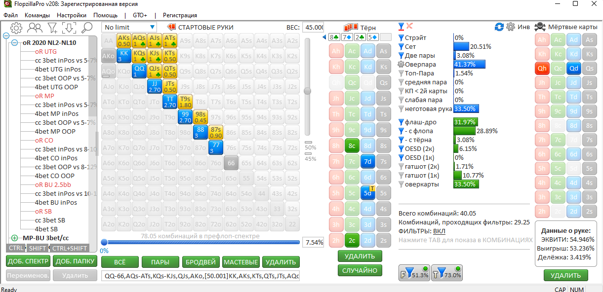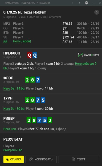 Неизвестный рег открывается с MP маленьким сайзингом 2бб, фиш на СО кол, все фолд, хиро на BB с рукой QQ сквиз 9бб в банк 5.5бб. Сайзинг нужно немного увеличить до 12бб. Учитывая, что мы будем в раздаче без позиции и наши QQ могут задоминировать вышедшие A и К. Цель сквиза – выбить лишнее эквити у оппонентов с неготовыми руками и собрать велью с фиша. Рег кол, фиш фолд.