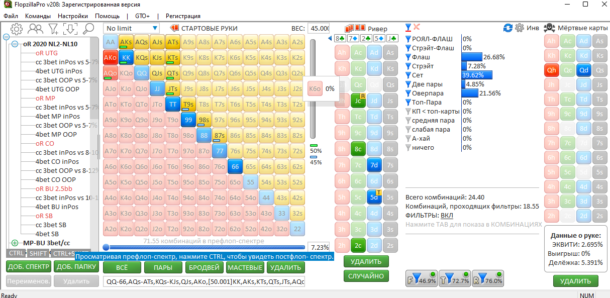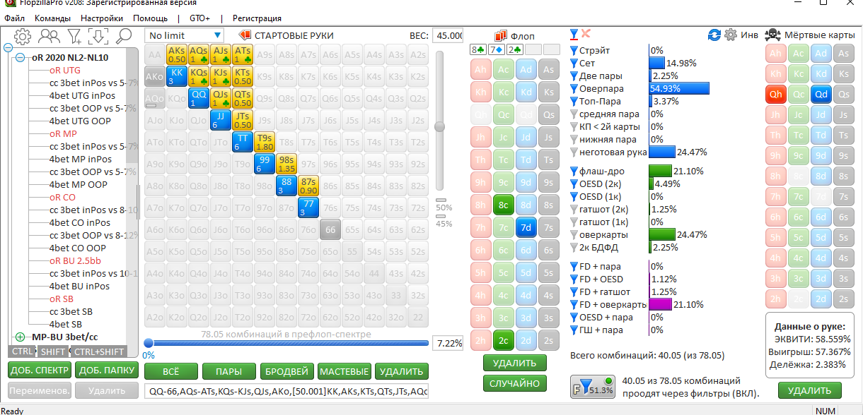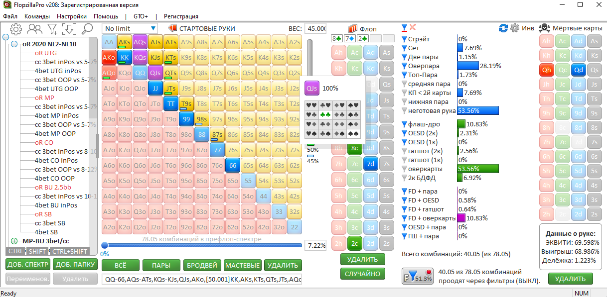 Мы видим, что у этой ставки было почти 50% фолд эквити и 58% эквити. Значит ставка хорошая. Сайзинг тоже считаю хорошим т.к. на следующих улицах можем получить много не приятных карт типа любой кресты, 9, которая закроет стрит по J10s, те же 10,J, которые могут закрыть сет, любые А и К тоже будут не кстати. Поэтому пытаемся выбить оппа плотной ставкой на флопе с неготовыми руками.