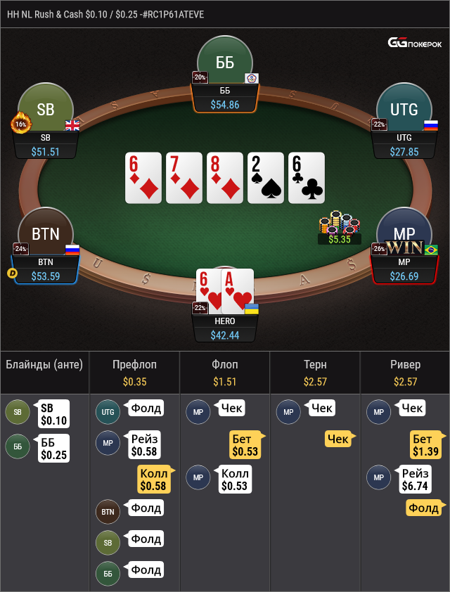 Ebony_Maw, спасибо за коммент. Да, действително немного лузовый колл с моей стороны на префлопе с такой рукой, думал зайти под фиша, но там после нас были и реги и вполне можно было ожидать сквиза и в таком случае пришлось бы фолдить эту руку.