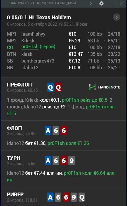 РЕКОМЕНДАЦИЯ: Прекращай играть по циферкам в хаде и в первую очередь оценивай префлоп диапазон оппонента и ситуацию, его типаж поведения на постфлопе, а самое главное борд, сайзинги и экшен, и только потом в граничных ситуациях мы ищем подсказки в попапах и хаде. Но не в этой раздаче.