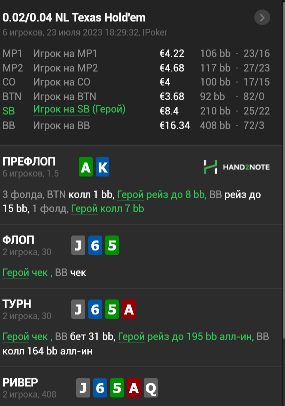 Ну а в целом надо было по тёрну вельюбетить самому, не пытаясь затянуть розыгрыш со столь мощной рукой, в недостаточно разогнанном банке. По флопу ты уже дал ему шанс поисполнять, которым он не воспользовался и считать что он начнёт исполнение на тёрне мы не можем не имея достаточных выборок на оппонента для оценки его статистики.