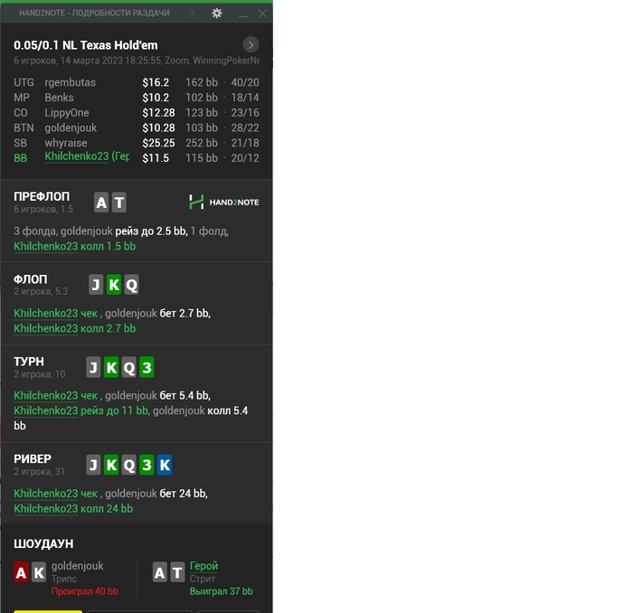 По тому как сыгранно, Ривер вообще мы не колим, мне кажется, на любую ставку.Что ты ожидаешь увидеть на ШД у человека, который исполнил невероятно сильное действие - отбил рейз терна. Рейз терна, по сути своей, уже смещен в сторону Велью чаще всего, в отличии например от флопа, где диапазон, как рейза, так и колла имеет пустые руки, поэтому в его действии минимум ТПТК, соответсвенно о колле речи идти не может.