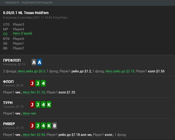 Так что по твоей линии чек-чек я играл бы только, если понимал, что мой соперник заманивает меня в ловушку (чекает с натсами намного чаще, глядя на мою агрессию как эксплойт). Но даже такой хитрец, ничего поделать не сможет, с прибыльностью нашего пуша на терне и постановкой точки в раздаче, пусть прибыль не велика (и скорее всего оптимальный розыгрыш другой), но решает многие проблемы в дальнейшем розыгрыше.
