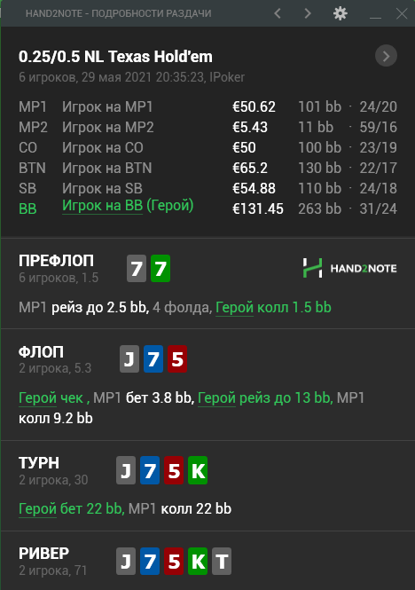 Ривер: Стритов у него мало на такой экшен. Сет валлетов он не всегда поставит на флопе особенно таким сайзом. КК быть у него могут, но как минимум в половине случаев он рейзнет их по тёрну. 55 так же могут быть у него. допер по KJ так же есть и скорее он не выкинет его, и возможно так же не выкинет АА, но это под вопросом. Ставить надо, и либо пушить, либо несмотря на глубину бет 1/2 чтобы расширить его колл, и похоже придётся колить его пуш, так как он рейзить ривер умеет в позе, а наша линия будет странной и одсы на колл будут приемлемые плюс в его рейзе на нашу ставку будут так же присутствовать когда-то 55, которые мы бьём и возможно некоторые KJ, но это под вопросом. Блефов в его пуше не будет с учётом глубины.