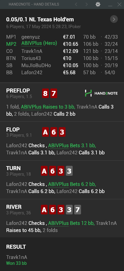 РИВЕР: ЧЕК! Здесь уже нет прямого вельюбета в двоих оппонентов. Чтобы он был, твоя рука должна стоить 35%+ эквити против диапазонов продолжения обоих оппонентов. В данном случае это крайне туманно. На тёрне сситуацию спасало то, что у них были дро, но на ривере они платить не станут миснутые дро.
