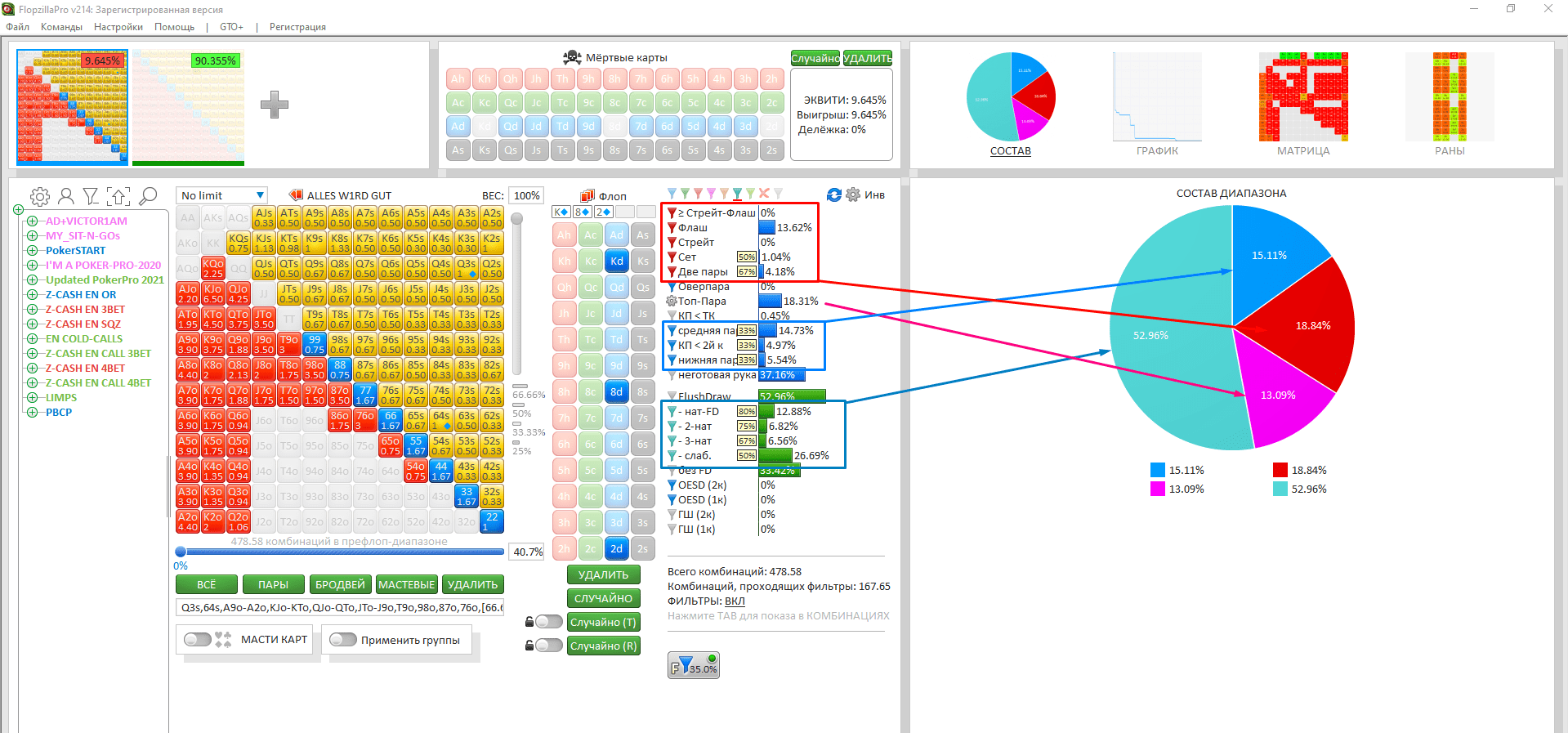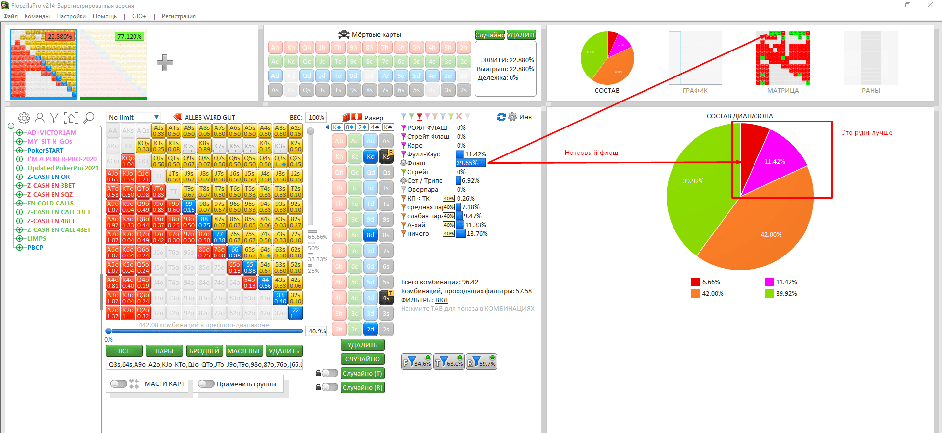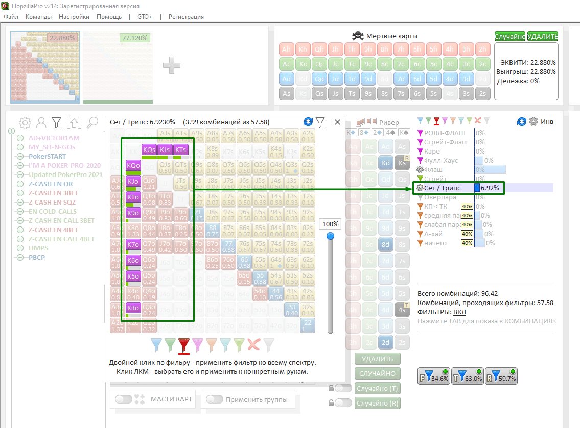 Пре: Противник не 3-бетил, а значит, у него сильно понижается доля Кх в рендже, которые формировали бы трипсы => ФХ. Но взамен растёт доля одномастных рук. Впрочем, против них у Q-хай-флаш стоять будет хорошо, потому что агровраг нередко за-3-бетит одномастные тузы.