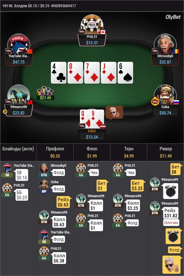 РИВЕР: Хороший бет правильного сайза! Получаем пушца и это лёкий фолд. Дело в том, что у оппонента практически нет флешей слабее нашего, а одсы на колл около 27%. Нам надо выигрывать здесь примерно 1 раз из 3 для плюсового колла. И на практике это не произойдёт против неизвестного фишного оппонента. Мы слишком часто посмотрим на , или .