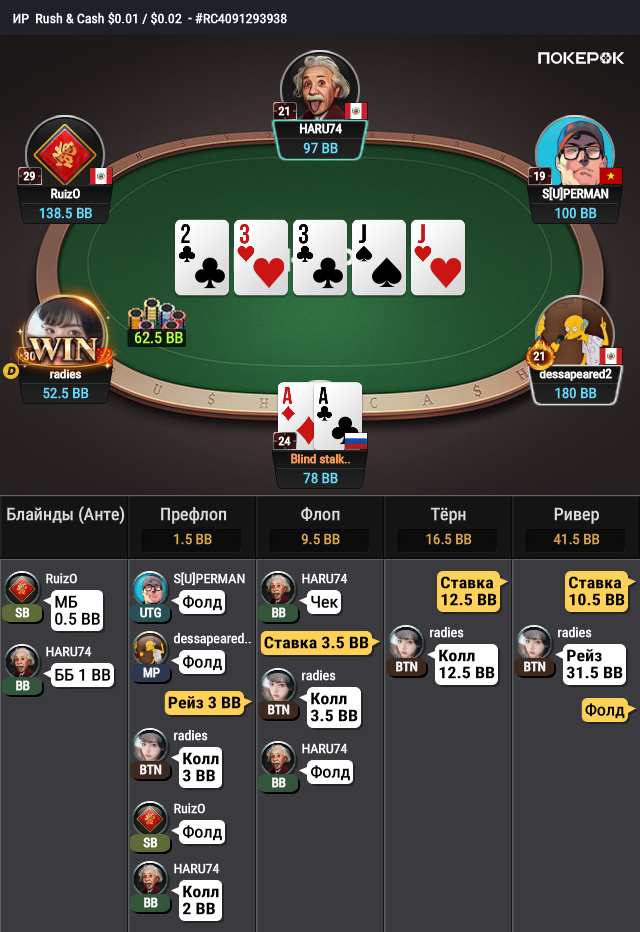 Пассивный нередко накрутит себя тем, что "ааа, бля, все дрова промазали - ты палюбэ блефуешь - я тя вскрою!". К тому же они видят две пары (+, это написано под комбинацией), а если их карман дошел до ривера, то их "две пары" тут часто "топовые".