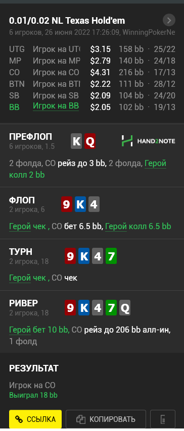 Привет. Обрати внимание на агрессию ривера - 0,8. При этом на флопе он играет очень агрессивно, но проход до SD и выигрыш на SD говорит больше в пользу его телефонных наклонностей. Линия похожа на доезд JT. Будет ли он так переигрывть младшие две пары? Без четких ридсов тут нельзя коллировать. Я бы ставил плотнее ривер с твоей стороны, на пуш - фолд. Как опция - 3b на префлопе. Главное правило микросов - велью бет и велью пас, тут денег нажил, там деньги спас.