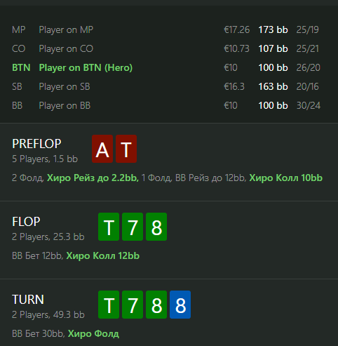 Соперник регуляр, но на него 800 рук, так что останавливаться на статистике, мы не будем. Раздача перед вами, что думаете? Это слишком нитовый фолд и мне стоит удалять покерный клиент)) Или все таки имеет место быть)