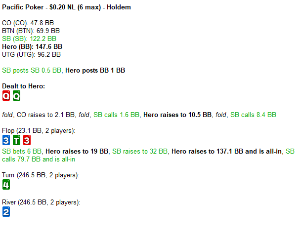 В целом же тут не будет ошибкой поставить крупно, но тогда нужно использовать 2 сайзинга: мелкий с тонкими вельюбетами и с блефами, у которых не так много эквити, и крупный с топовым велью и лучшими блефами. Исходя из того, что я вижу, то у большинства регов средних и уж тем более микролимитов очень плохо получается структурировать больше одного сайзинга и я придерживаюсь стратегии по таким линиям играть от одного сайзинга, причем такое вижу даже на высоких лимитах, поэтому и пишу, что тут от всего спектра нужно играть мелким сайзингом, который на самом деле дает автопрофит, а значит в него эксплуатационно можно переблефовывать, причем дешево.