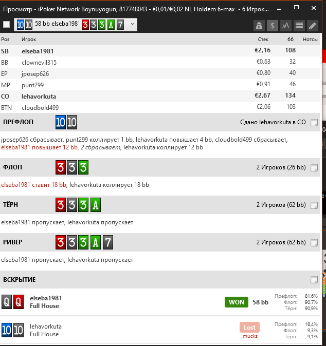 Оппоненты-фиши. До риаера, мне кажется. все стандартно. На ривере мы проигрываем JJ,QQ,KK и бьем 77.88.99. Тузов оппонент часто сам поставит. Решил, что мелких карманок в диапазоне 3бета фиша может и не быть и прочекал. Стоило ли добирать?