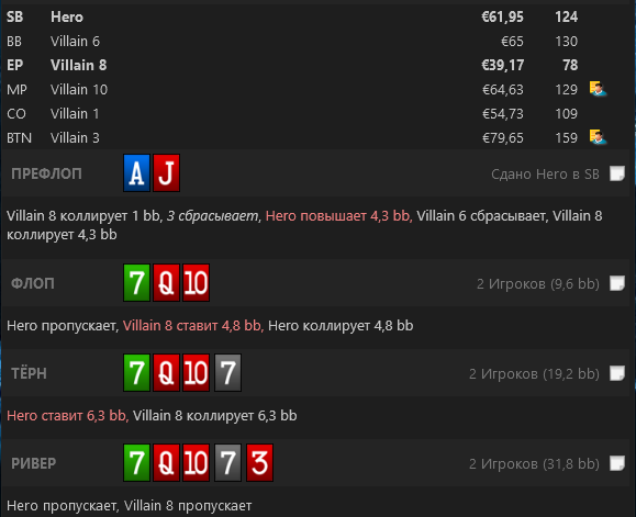 Интересная ситуация на терне, если дать фишу поставить, то он конечно поставит не всегда, но достаточно часто (около 60% случаев) и как правило, он поставит половину пота или выше, что может вынудить нас сдаться, а делать этого не хочется. С другой стороны, на доннк андербет у нас будет кое какое ФЭ, а также вероятность, что фиш зарейзит намного ниже, чем что он поставит в чек, так что мы лучше реализуем свое эквити. Но, что нам делать дальше, на таком ривере?