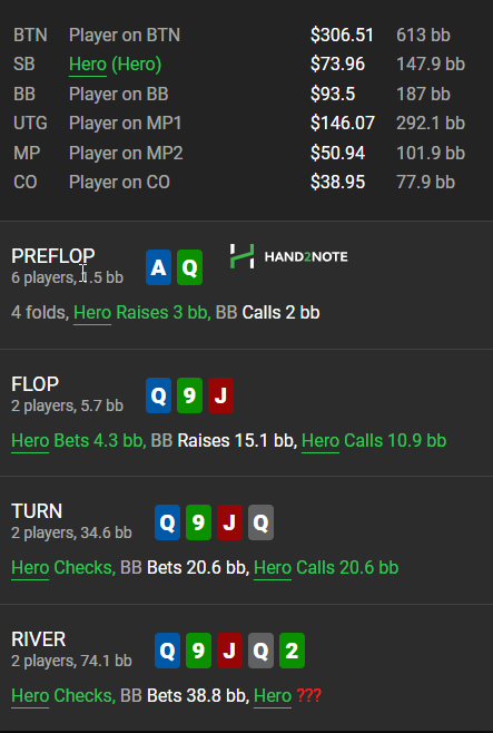 . Наша рука бита в щепки и не стоит уже тех денег что за неё просят, так как оппонент явно не станет блефовать тут с частотой 35%, чтобы сделать наше проддолжение плюсовым. Ну или же переигрывать те немногочисленные трипсы слабее нашего, из числа топпар что могли рейзить изредка флоп и добавлять к ним достаточно блефа, чтобы обеспечить наше продолжение.