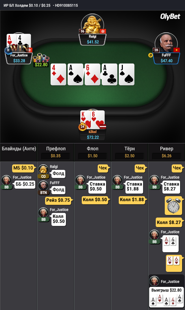 Ривер: Фолд. Во первых считаю что противники могут недоблефовывать такой ривер. А он еще и делает это конем. Разве есть смысл таким сайзингом блефовать? Когда у тебя может быть куча трипсов которые в среднем поляна не сможет выкинуть. Очень легкий фолд у тебя тут.