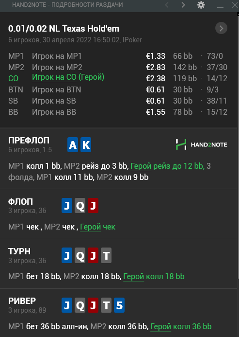 APXAHrEJI73, я ошибся назвав сквизом изо3бет, и допустим ты прав и выборка небольшая на оппонента на МР2, однако стоит отметить что он изолил сайзом 3бб, что уже наводит на мысль о том, что он скорее всего не рег, или как минимум некомпетентный рег. А ты про 4бб пишешь какие-то, хотя их не было в раздаче. Сайз изола в 3бб, совместно со статами 37/30 пусть и на неизвестную выборку приводят меня к мысли о том, что даже если это и рег, то он точно не силён. Сильный рег не будет изолить такое тело 66/0, сайзом 3бб. Он скорее даст взрослым сазйом изол на 5-7бб, чтобы соблазна не было другим регам в позе, да и без позы заползти посмотреть флоп. Поэтому скорее всего это обычный фишман. Сайз 12бб для изо3бета против двух или 1,5 фишей мелковат. Стоит изолить мощнее чтобы как можно сильнее снижать СПР и вероятность образования мультипота.