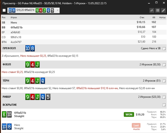 нас не интересуют. Нам нужен весь его стек к риверу и ни цента меньше. СПР примерно 9. Поэтому ставим овербет 1,5х на тёрне с планом пуша ривера. Идея очень проста. Если у него сейчас