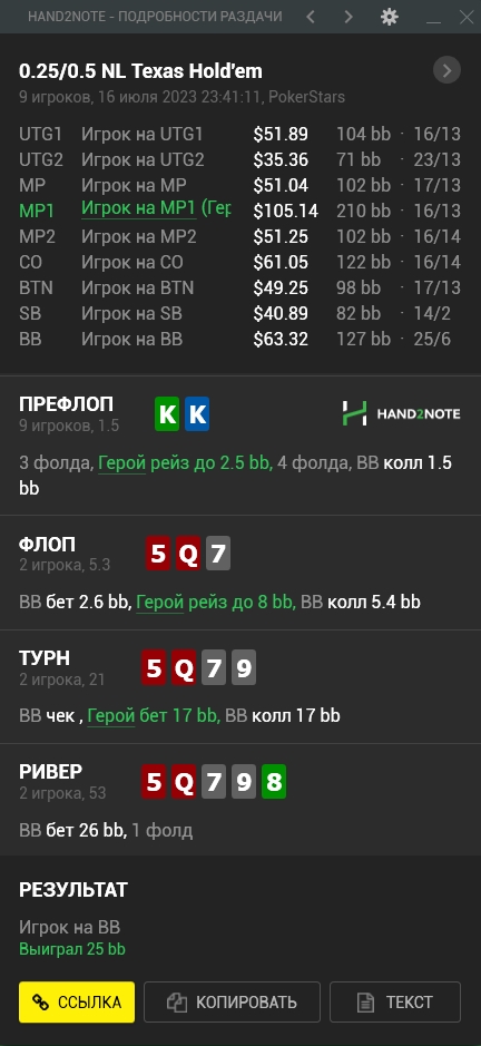 РИВЕР: Хороший, образцовый фолд! Несмотря на то, что одсы были в районе 25%, в диапзоне донка по 4срейтриверу у оппонента практически не будет рук слабее нашей, так как они не склонны в такие борды пытаться ставить топпары, а вот допер+ категории там хоть отбавляй. С блефами так же проблема будет у оппонента, так как многие слабые руки получили усиление ещё по тёрну и теперь на ривере и они нас бьют. Поэтому наша рука уже не стоит тех денег, что хочет за неё оппонент.