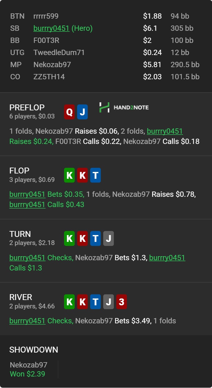 От себя добавлю, почему решил играть так: оппонент входил в игру с мп. на такой доске у него часто в диапазоне будут Kx в кармане. Соответственно в данном случае я думал, что у него может быть сет. Потом проверил в эквилабе, и он мне показал, что в большинстве случаев я буду выигрывать в подобной ситуации, так как у меня две пары.
