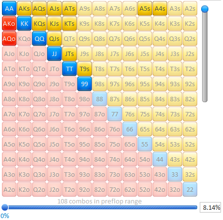 Фолд префлоп. Максимальный рендж который можно 3 бетить на Sb против MP выглядит так. (это если MP открывает широко, порядка 20%).