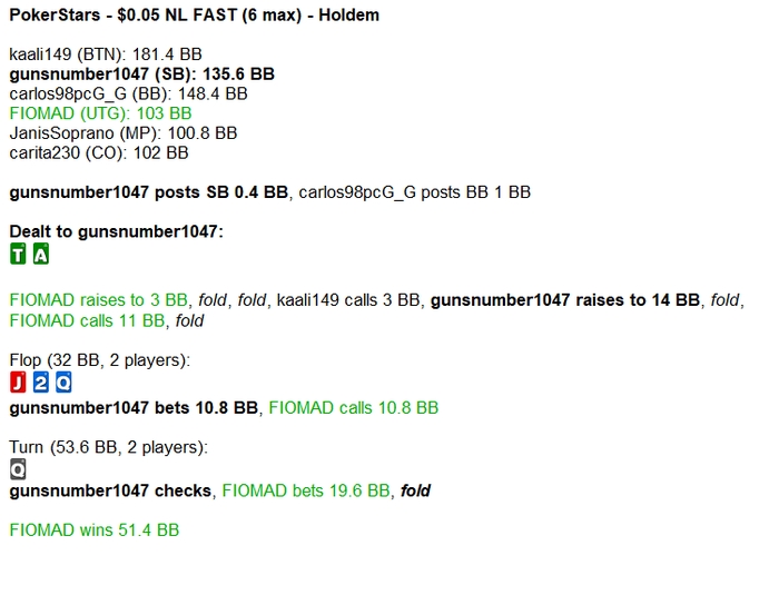 В любом случае с этой рукой я по терну не ставил бы т.к блочит потенциальные фолды имеет мало эквити.