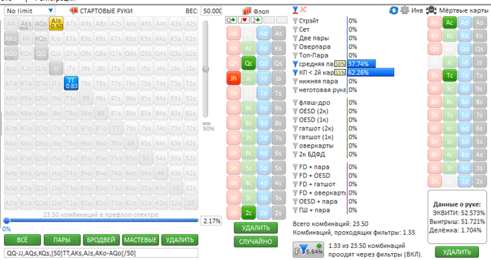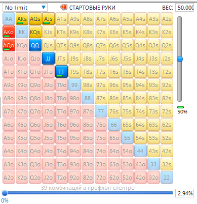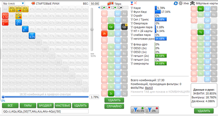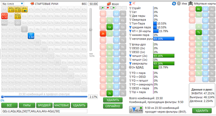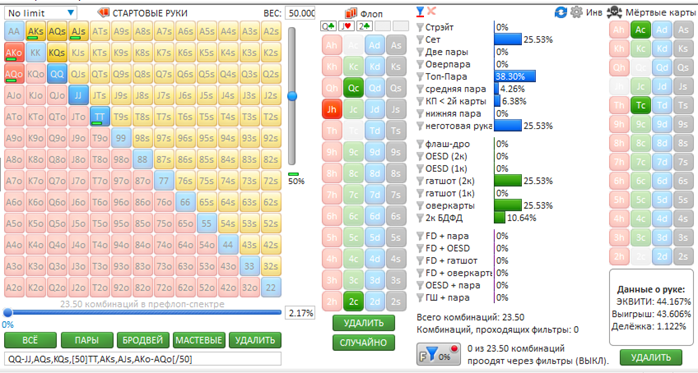 Всем привет! Жалко, что кроме размеров стеков на оппонента нету информации. Ну да ладно, давайте разбираться. Префлоп: сквиз на SB против ранней с ATs не лучший вариант, конечно, так как разыгрывать постфлоп с неготовой рукой без позиции сложновато будет. Знать бы что за оппоненты) думаю, можно и зарывать такую руку. На флопе мы с гатшотом, оверкартой, вроде как неплохо, но рука-то неготовая. Будем ставить в блеф, чтобы выбить руки сильнее или не дать собрать такие, а может и сами соберем натсик) Давайте посмотрим во Флопзилке какая ситуация. Зададим спектр колла сквиза оппоненту на UTG. Если это регулярный игрок, то будет что-то такое: