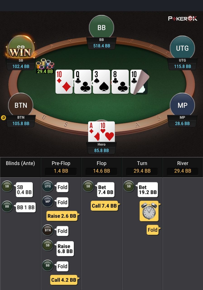 Флоп тоже думаю слабо плюсовой будет, мы должны такую руку защищать, так как широко зашли под такой мелкий 3бет. Но нужно понимать, что аут на доппер у тебя не самый лучший, по выходу туза нужно все равно быть осторожным, так как у оппа будет много рук лучше твоей. В этом плане например