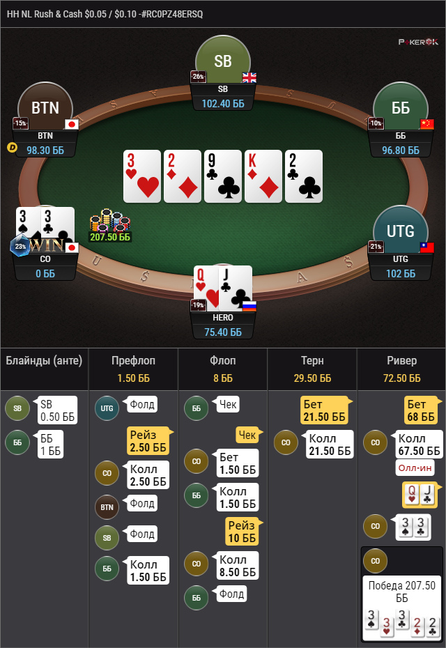 Плохо что непойми с кем сыграна раздача. Выкладывай информацию сессионную. В Раше бывает и по 5к рук на оппонентов. И они все должны быть размечены у тебя цветовыми метками.
