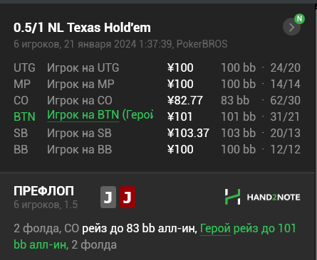 Тут если так задуматься и AKo можно сфолдить, хотя во время раздачи я бы скорее не справился. Хотя тут сложно сказать что тут лучше JJ или AKo.