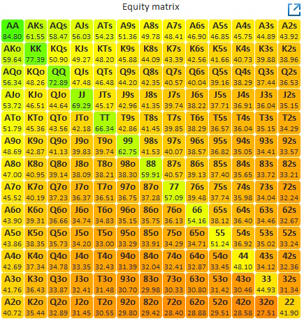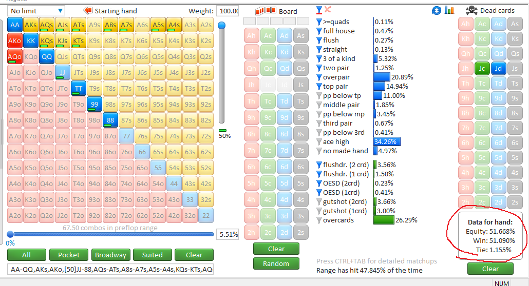 APXAHrEJI73, Про 60% согласен полностью, сам к такой цифре пришел, но диап фиша ты уж очень пессимистично представил. Прикладываю рисерч опен пуша фишей со стеком 60бб+, 40+ впипа, 20%+ пфра и меньше 10% опен пуша. Также как я вбил его во флопзиллу и как разные руки стоят против этого диапазона. У 88+, АК эквити достаточно. У АQs уже нет. Видимо потому что наибольший вес у рейнжа фишей имеют кармашки и АК.
