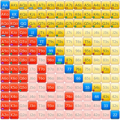 Сел за новый стол и успел откатать пару кругов, опен пушей от фиша до этого момента не было, рук 70, впип и пфр 62/30, 3 бет 22%. Где в такой ситуации низ колла по парам? Как играем АК?