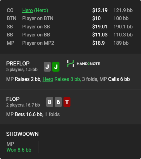 Отправил JJ в 3-бет против фиша 74/36/16.